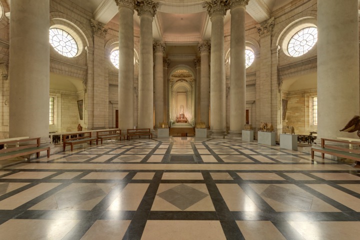 La longueur intérieure de l'édifice est de 104 m, (115 avec la chapelle de la Vierge; sa largeur dans la nef est de 28 m et de 56 m au transept. Sa hauteur est de 32 m sous la voûte. Entre les fenêtres hautes et les colonnes, un entablement court sans fin autour de l'ensemble de l'église. Les hautes colonnes rondes sont couronnées par des chapiteaux corinthiens. Cette combinaison harmonieuse de lignes horizontales et verticales confère à l'ensemble un caractère majestueux.